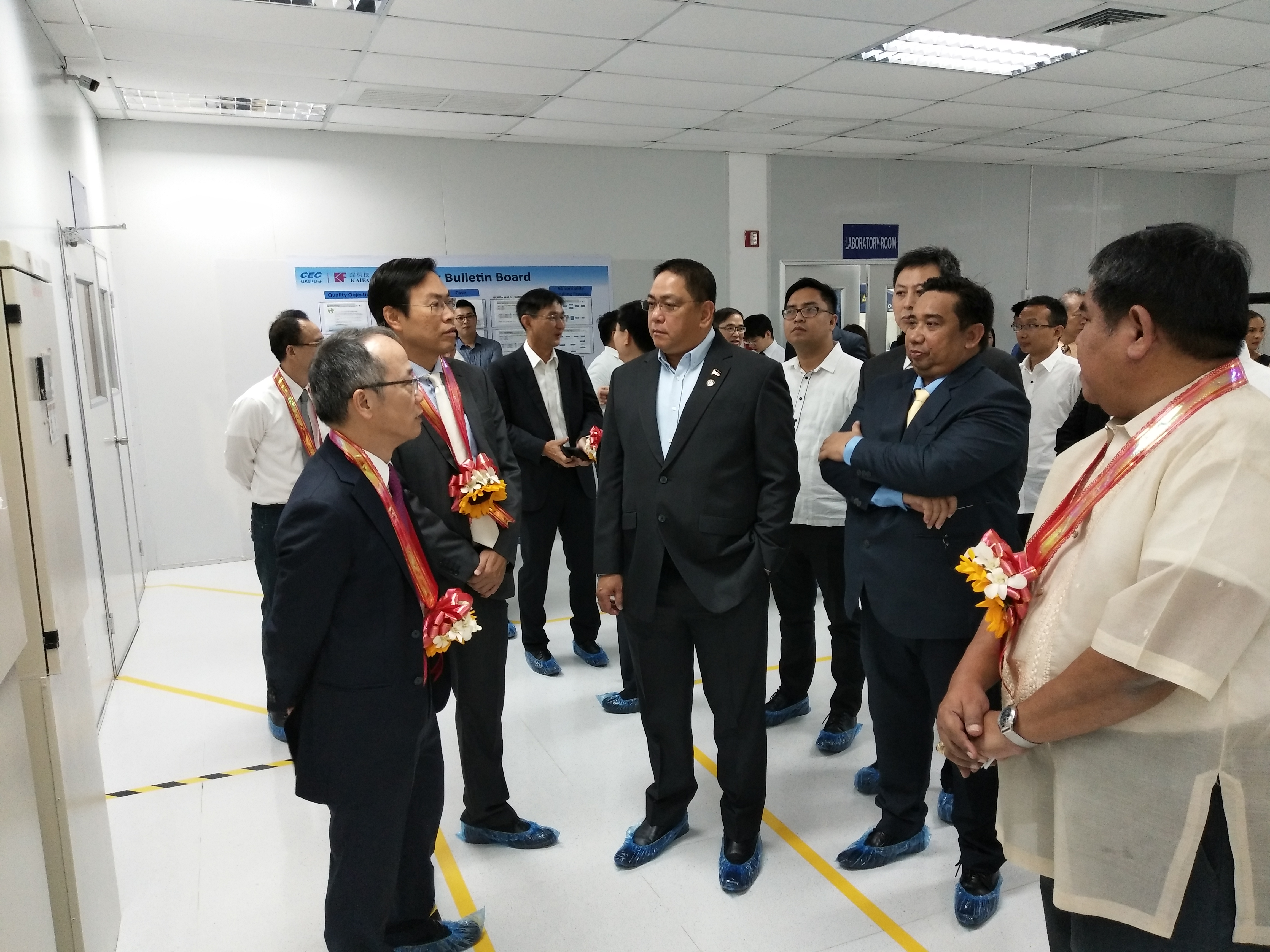 剪彩仪式结束后,公司领导、菲律宾政府部门及机构领导和客户代表等一起参观了菲律宾公司的生产车间,实地了解公司生产线的布局情况、工序与产能。公司党委委员、总裁办公室总监吴鸿彬、盛龙,财务部总监彭秧,物业管理中心总监涂国求,商业与工业产品事业部总经理周浩、袁培志、曹晶,香港公司总经理李文胜参加活动.